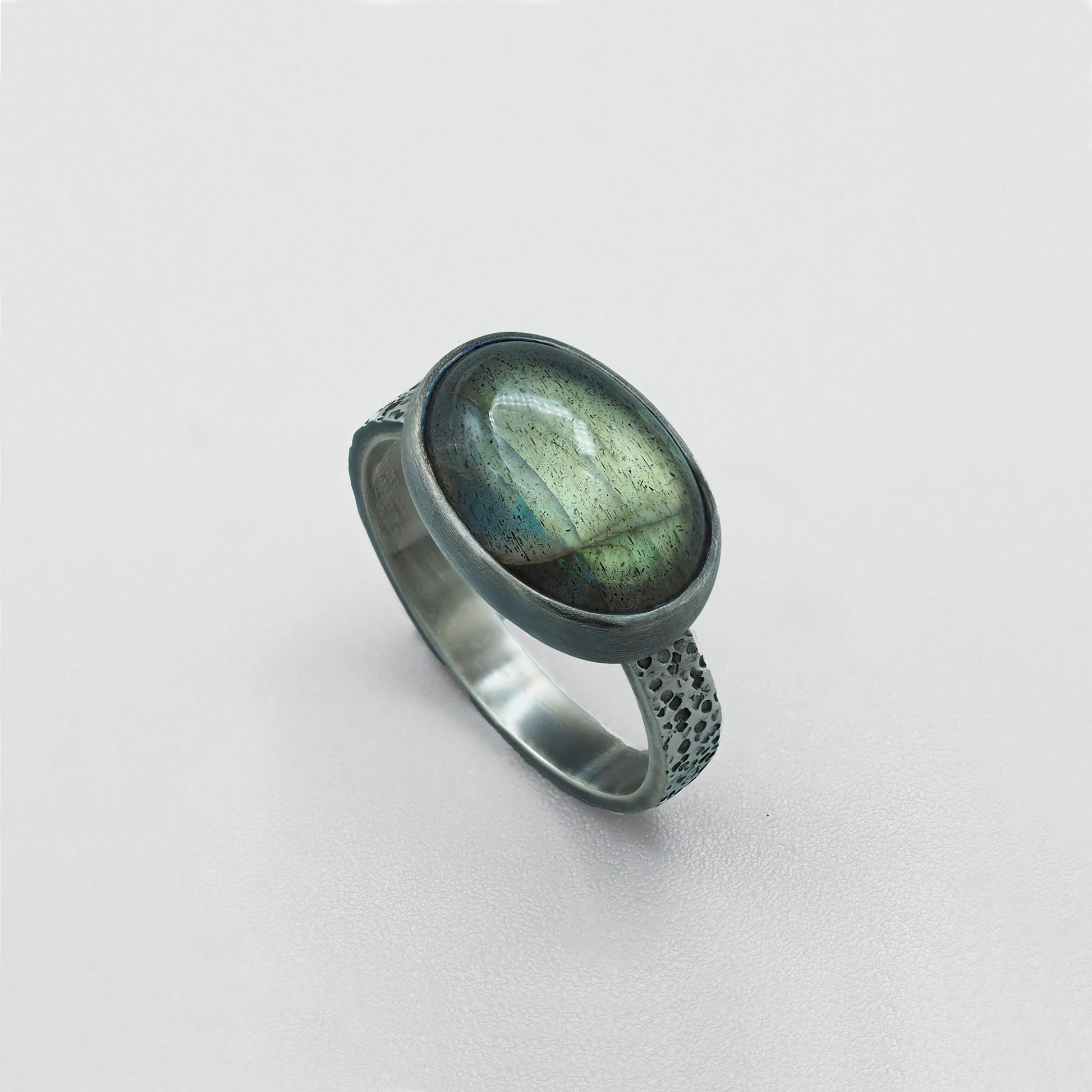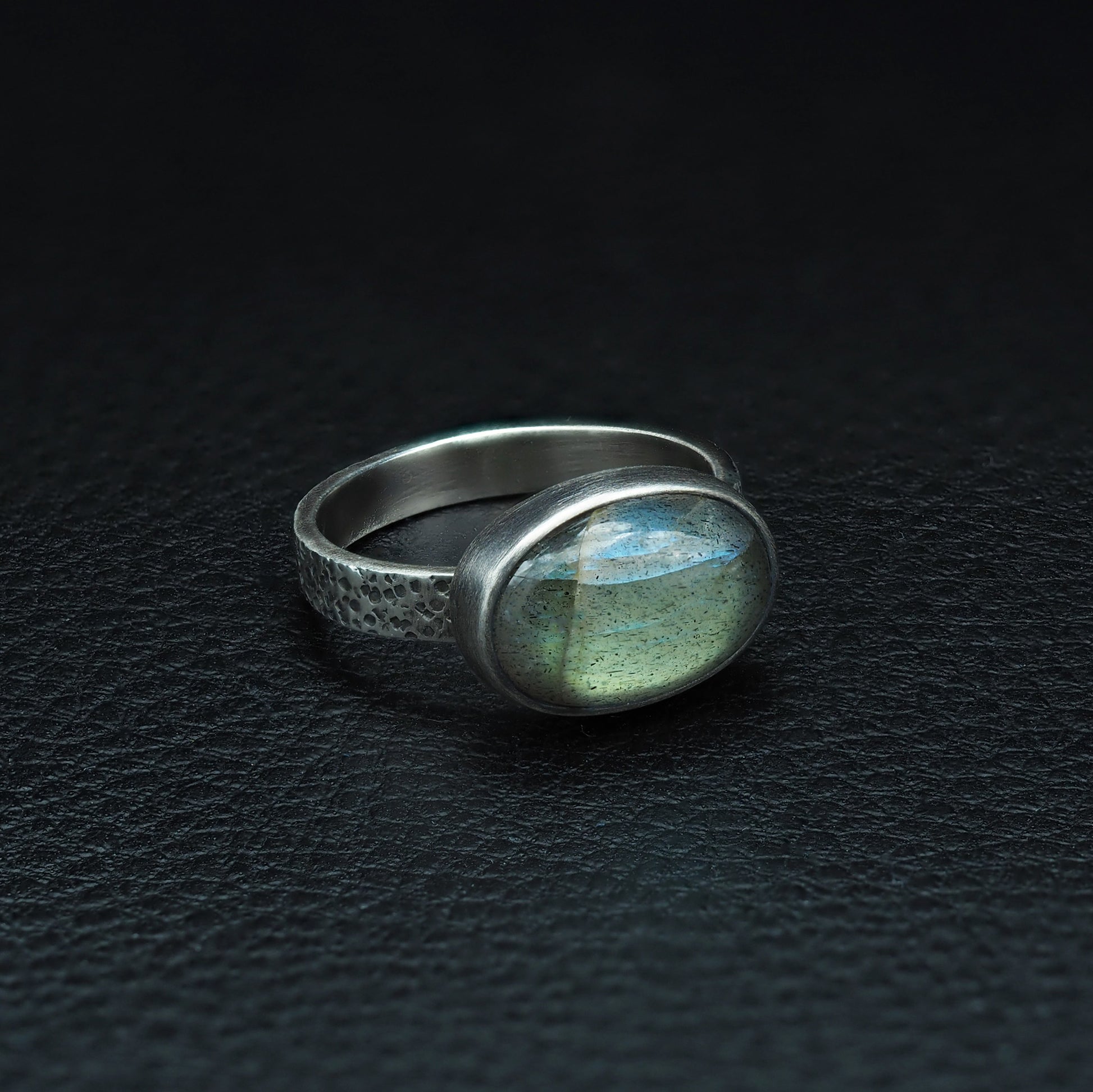 A handcrafted ring featuring an oval labradorite set in a bezel on an oxidized, textured silver shank. Suitable for everyday wear.