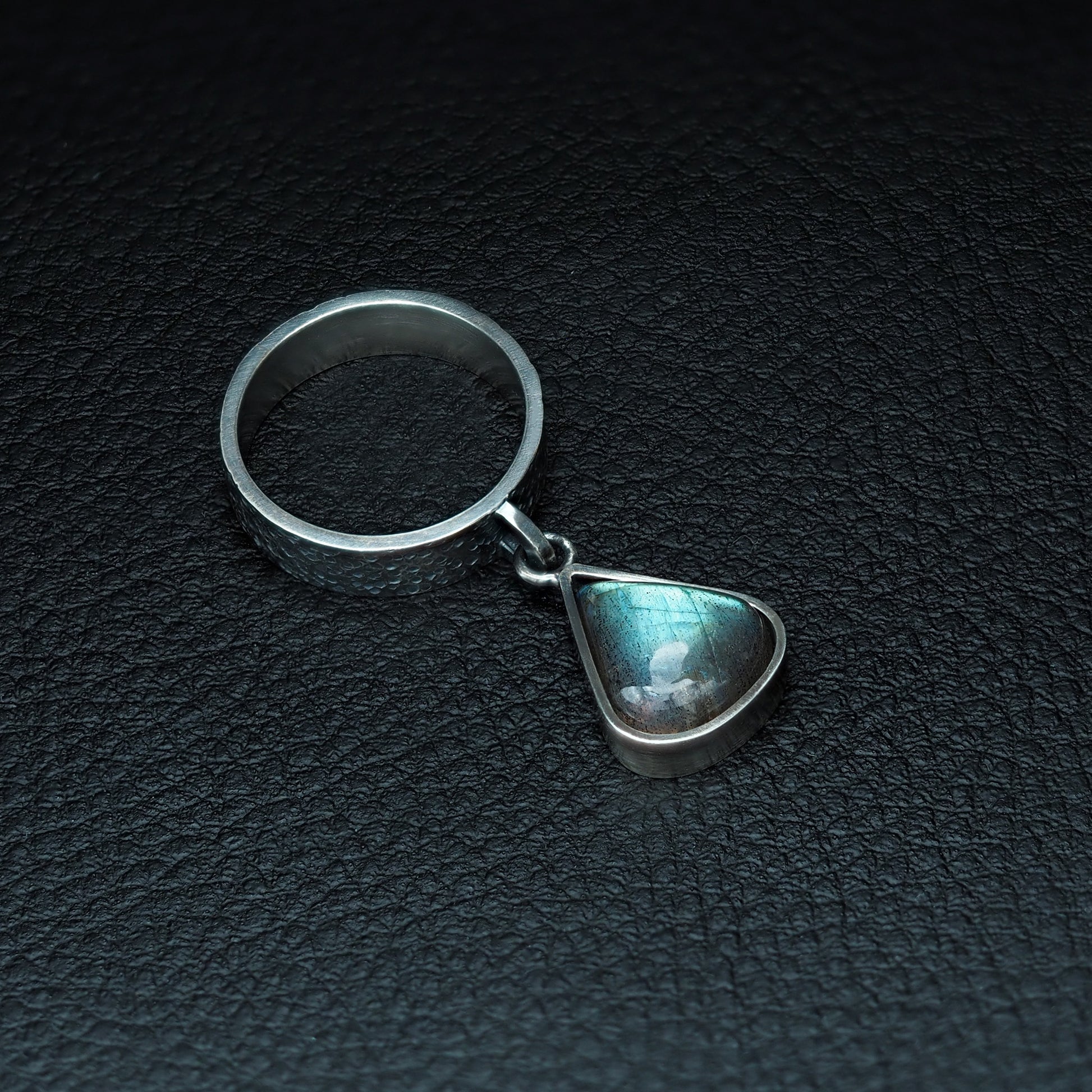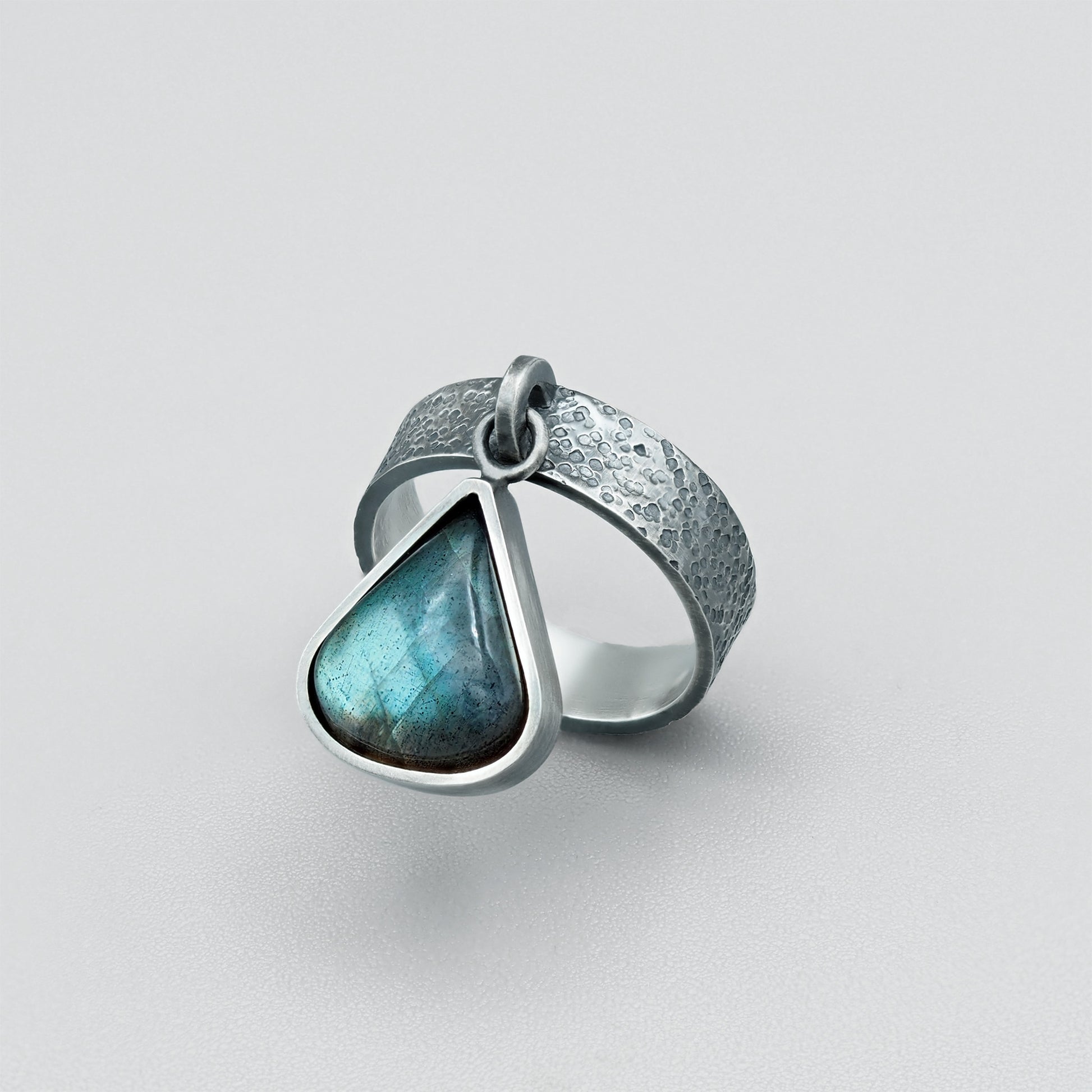 An oxidized silver ring featuring a teardrop-shaped labradorite gemstone encased in a bezel setting. The gemstone is connected to the shank via small silver jump ring, allowing it to dangle and sway with the movement of your hand, creating a dynamic interplay of light and motion. The subtle oxidized finish enhances the rustic yet modern aesthetic, while the labradorite's iridescent sheen adds a mystical, ever-changing allure.