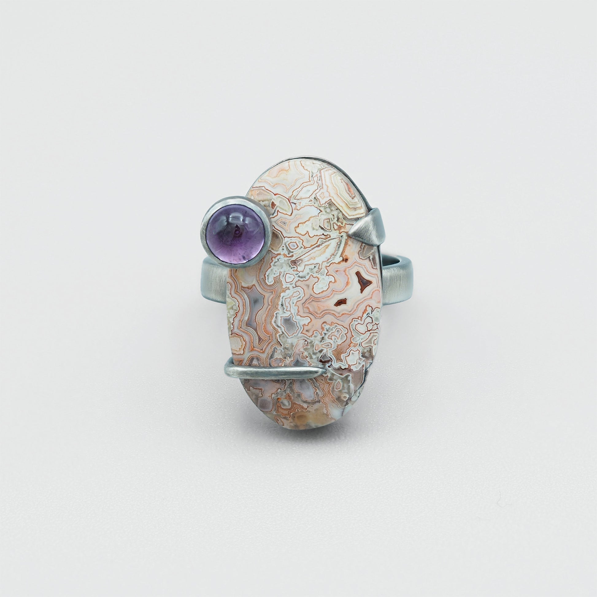 This stunning silver ring showcases an oval Laguna Lace Agate with mesmerizing patterns in soft pink and grey hues, creating a harmonious blend of colors that exude natural beauty and tranquility. The agate is paired with a delicate small round Amethyst, adding a pop of rich purple that enhances the overall design.