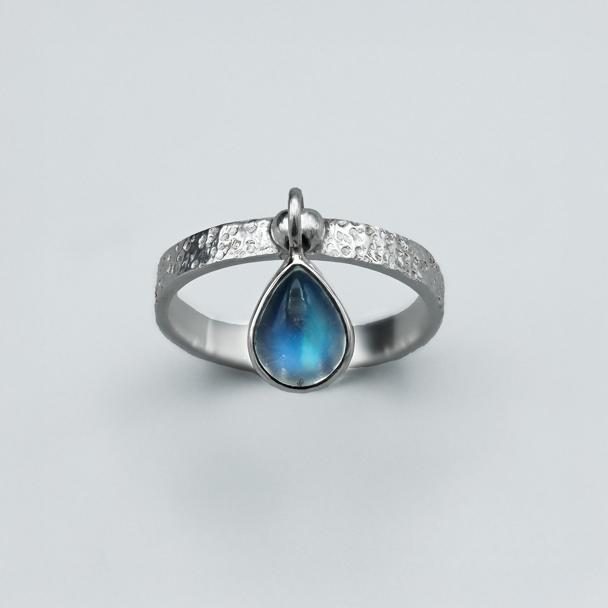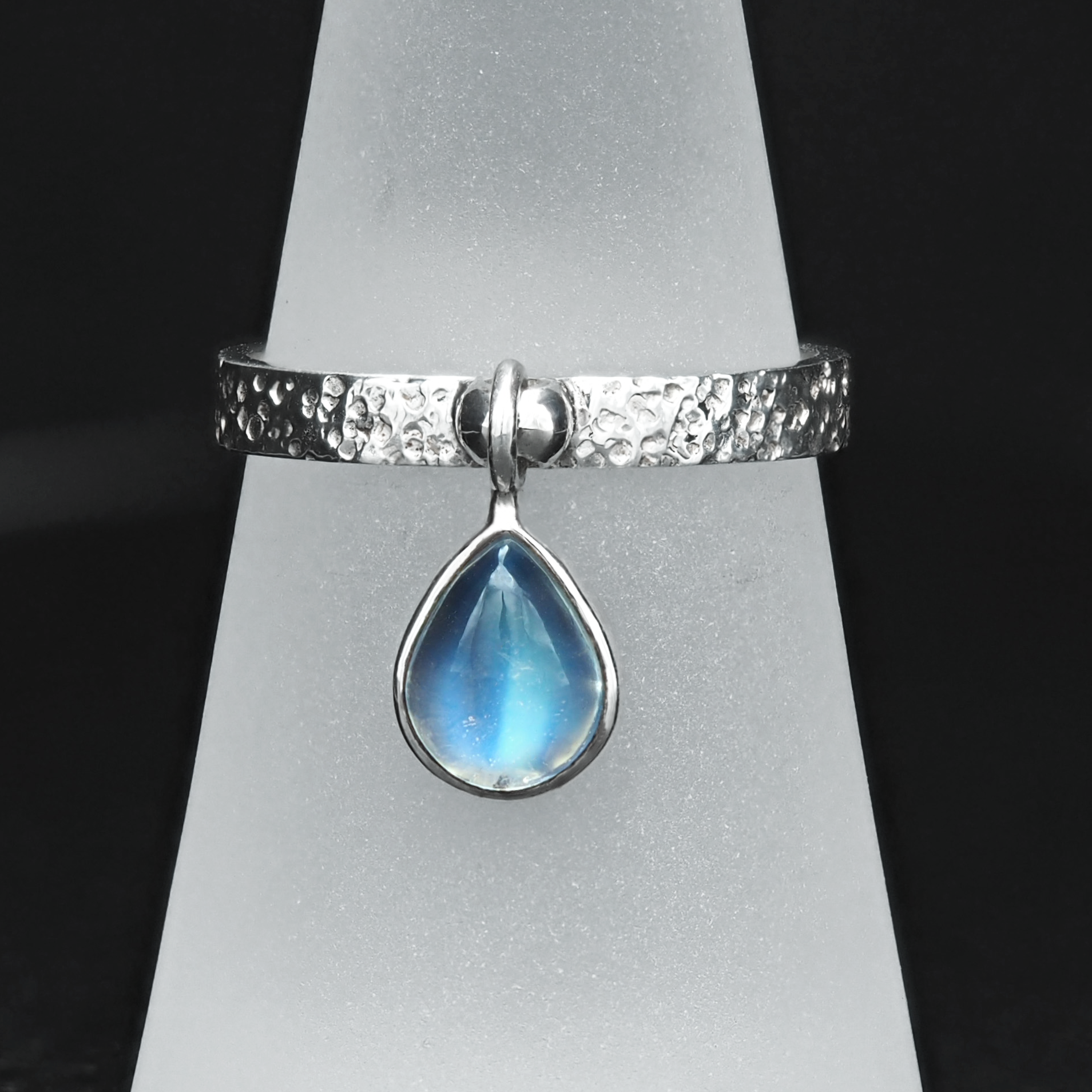 A delicate silver ring featuring a teardrop-shaped dangling moonstone gemstone encased in a bezel setting. This versatile design allows the ring to double as a pendant—simply thread a silk cord through the shank to transform it into a necklace.