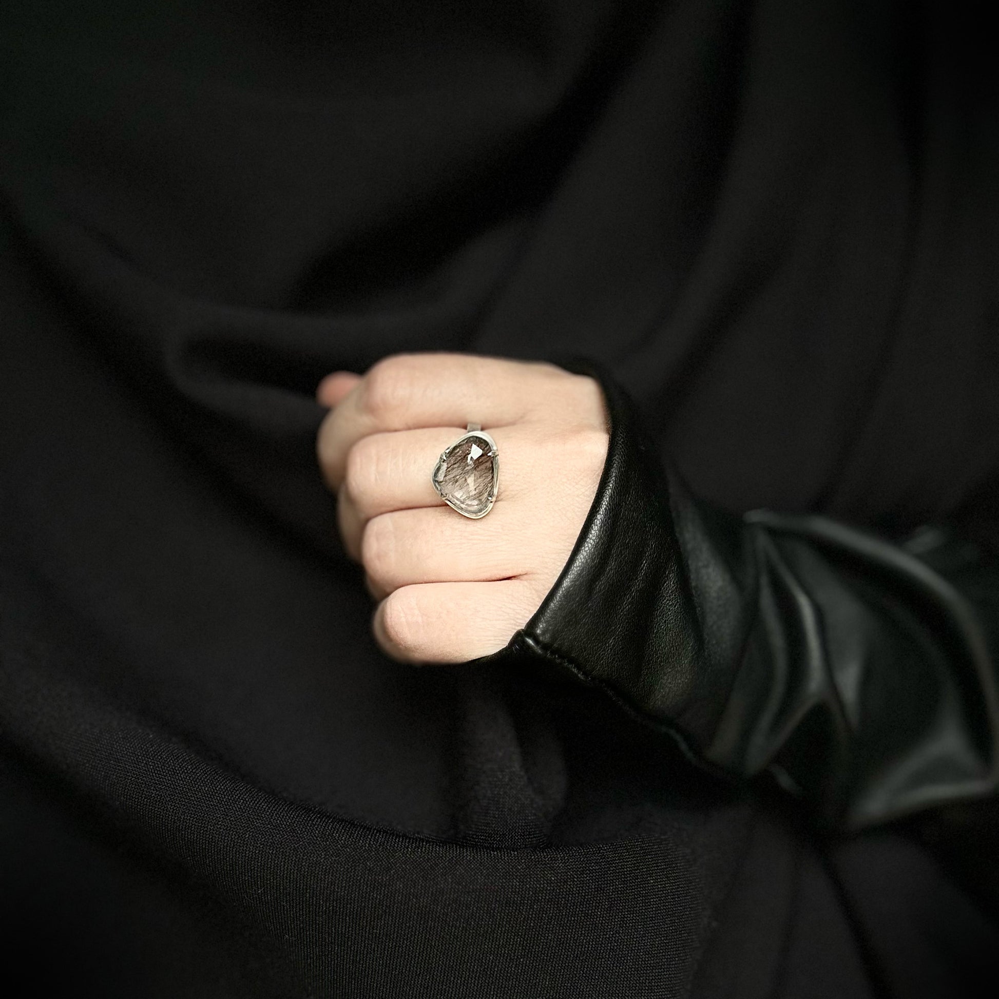 A handcrafted silver ring featuring a captivating medium-size irregular tourmalinated quartz gemstone.